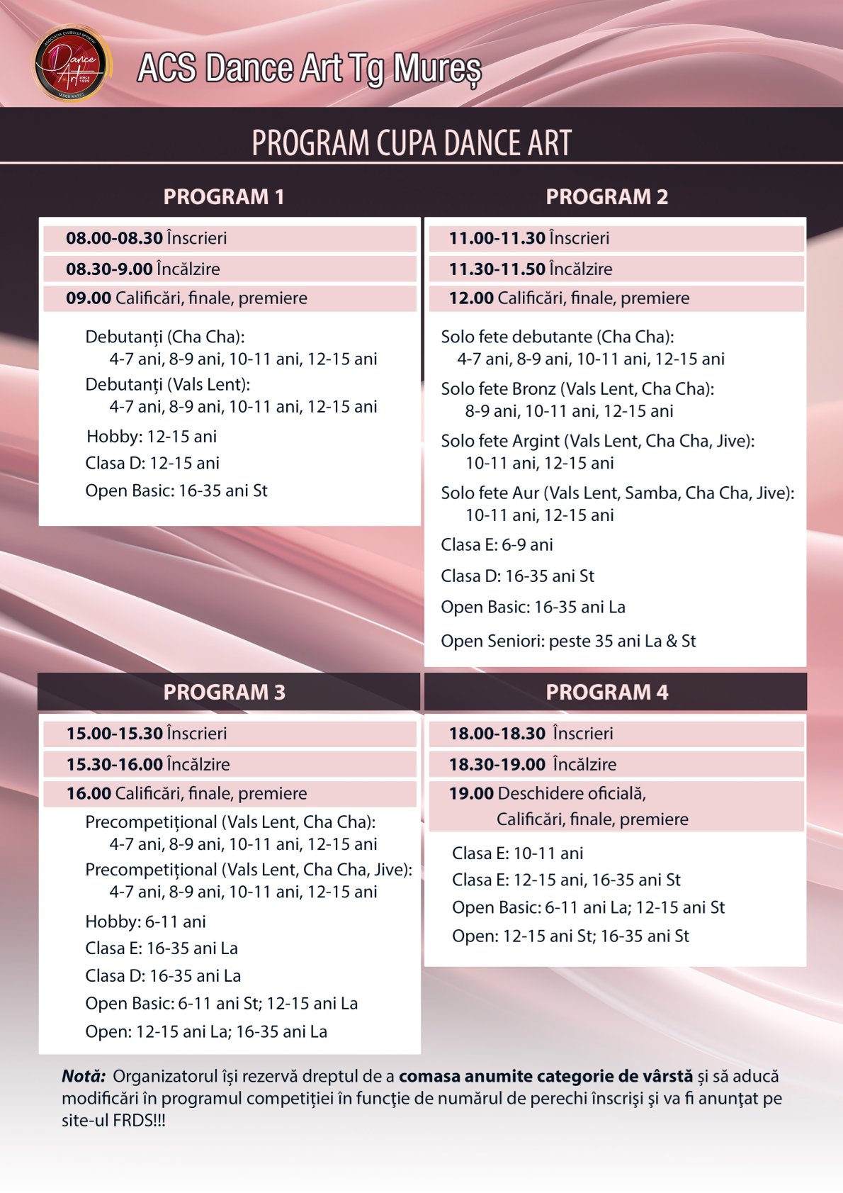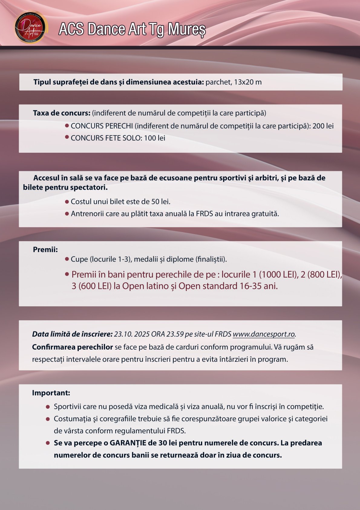 Te așteptăm la Gala de deschidere a Cupei DANCE ART 2024 pe 26 octombrie 2024, ora 19:00, la Sala de sport Sântana de Mureș.